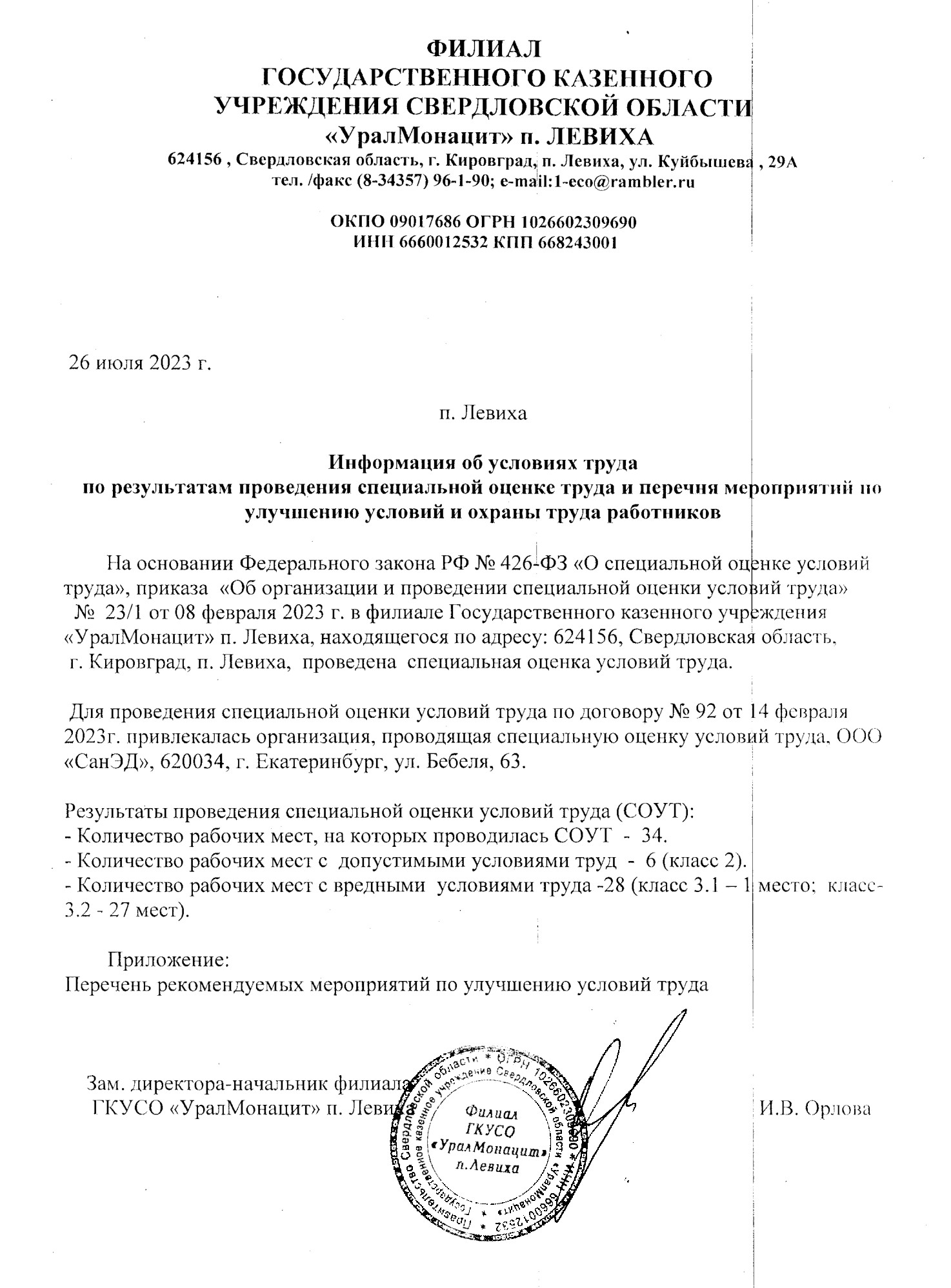 1. 623317, Свердловская область, Муниципальное образование Красноуфимский округ, село Чувашково.Филиал является радиационно - опасным объектом (РОО);